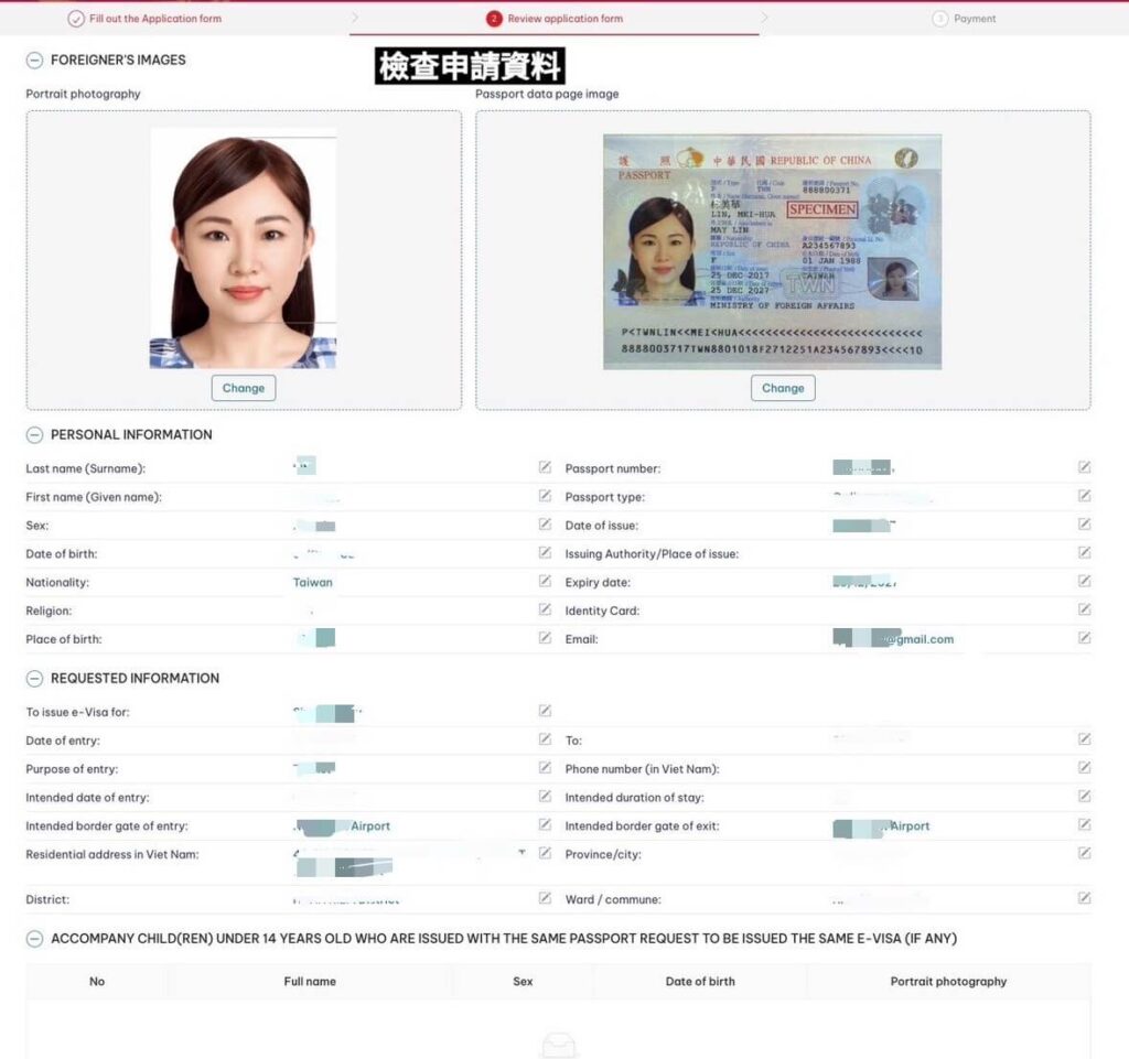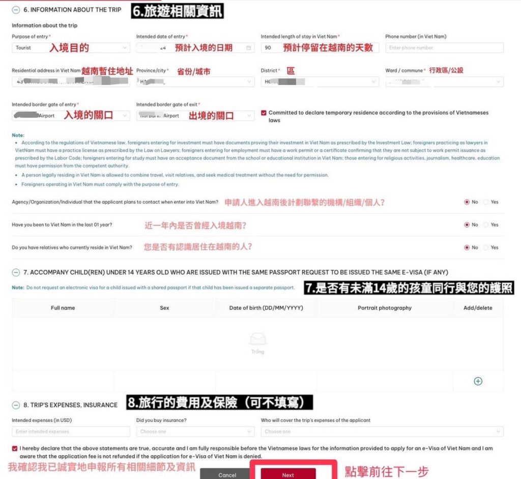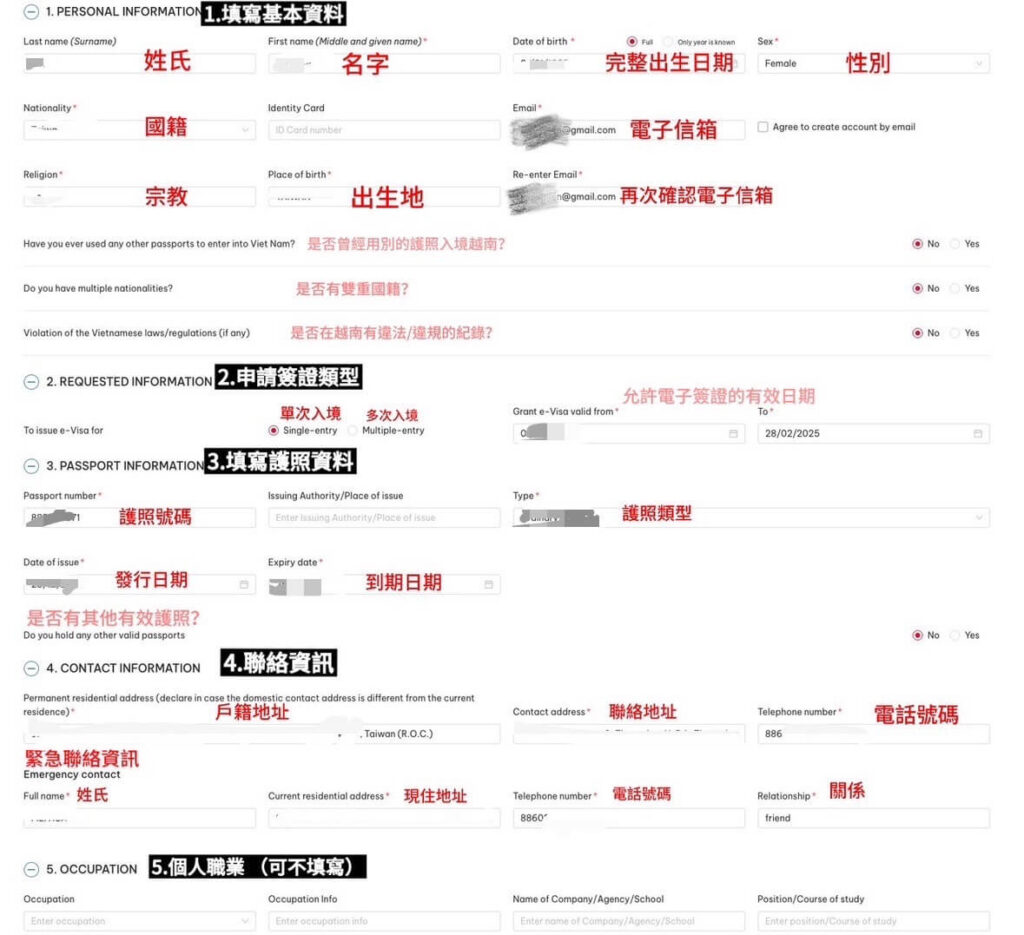 - 仔細填寫個人資料、入出境日期、停留天數、在越南的住址、入境機場等資訊。