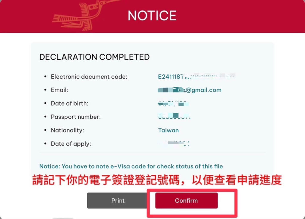 - 記得把收到的電子簽證查詢號碼記下來,可以隨時用它查看簽證申請進度。