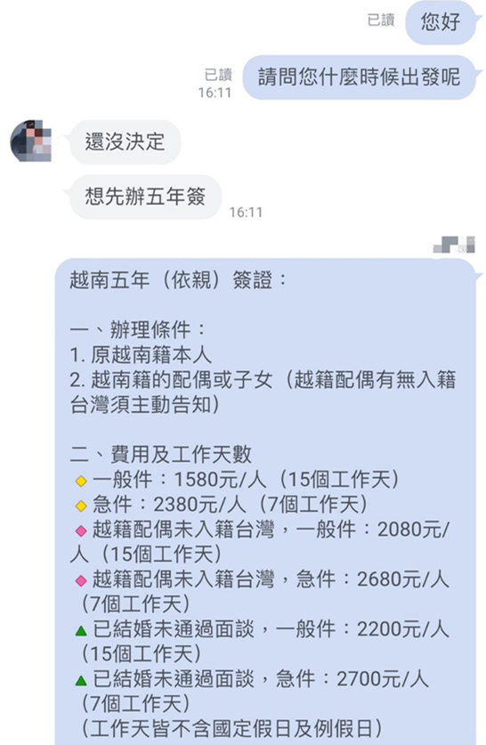 越籍配偶未入籍台灣,急件:2680元/人(7個工作天)