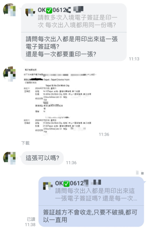 申請越南簽證有分單次入境和多次入境,這位客人向越南簽證王申請多次出入境的電子簽證,簽發後我們均透過Line提供簽證文件,直接印出即可使用,若紙本遺失,下載過的檔案仍會保存在對話紀錄中,或也可以即時聯繫我們重新提供。