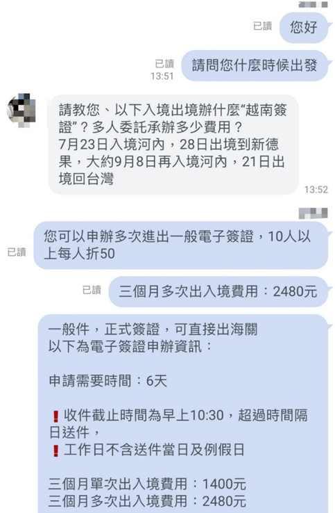 客人:請教您,以下入境出境辦什麼“越南簽證”?多人委託承辦多少費用?