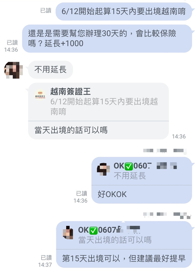 客人:不用延長,當天出境的話可以嗎? 越南簽證王:第15天出境可以,但建議最好提早
